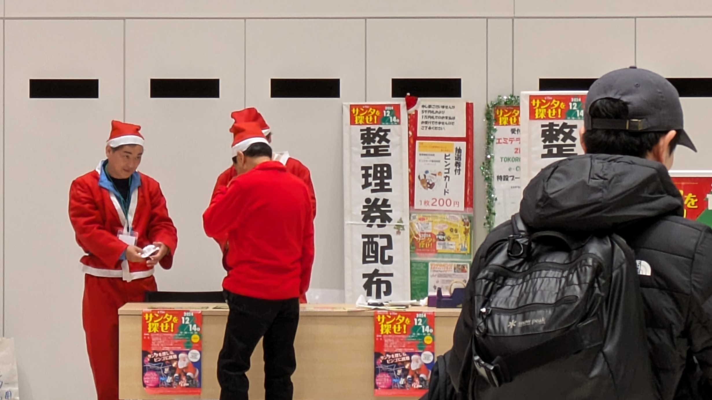 ②街なかにいるサンタたちを探して、カードに書かれた番号と照らし合わせ。サンタさんからチェックやサインをもらってビンゴを目指します。
