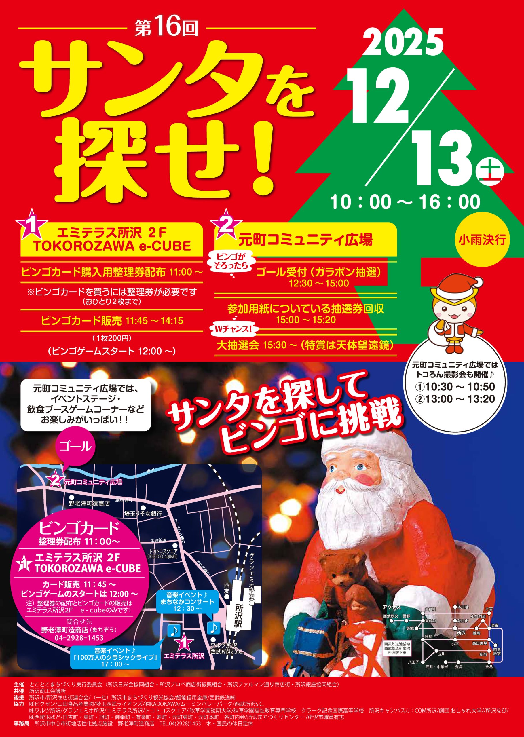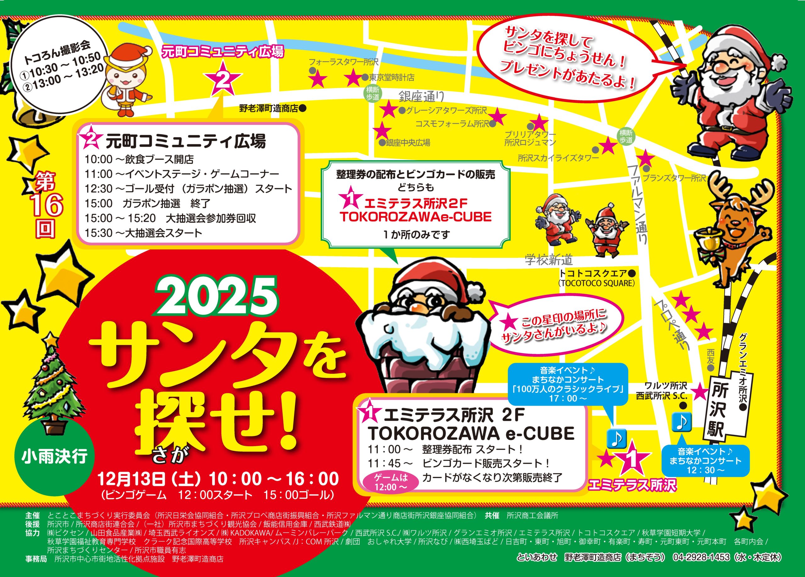 街なかにいるサンタを探しながら、ビンゴに挑戦する冬の恒例イベント。今年も所沢のまちが、笑顔あふれる赤に染まります。家族やお友だちと一緒に、ワイワイ楽しいまち歩きをお楽しみください。今年もとこぎんエリアの「元町コミュニティ広場」がゴール会場となり、ガラポン抽選会会場になり、イベントステージやゲームコーナー、飲食ブースが楽しめます。