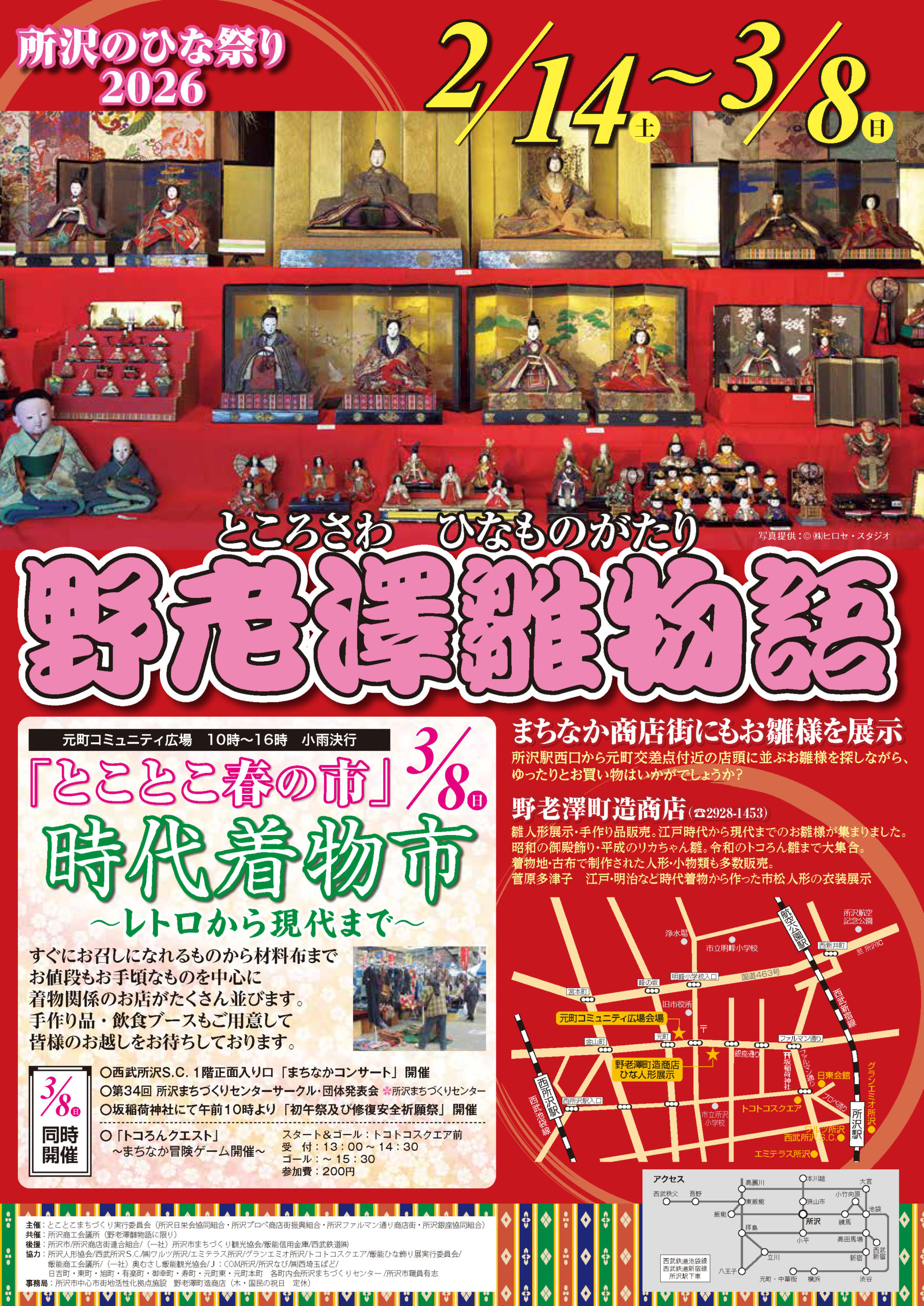 期間中は、所沢駅西口から元町交差点付近にかけて、協力店舗の店頭にお雛様が登場。とこぎん(所沢銀座商店街)の各店でも、まち歩きが楽しくなる“ひな飾り”で皆さまをお迎えします。
