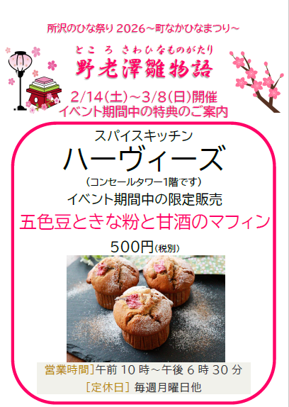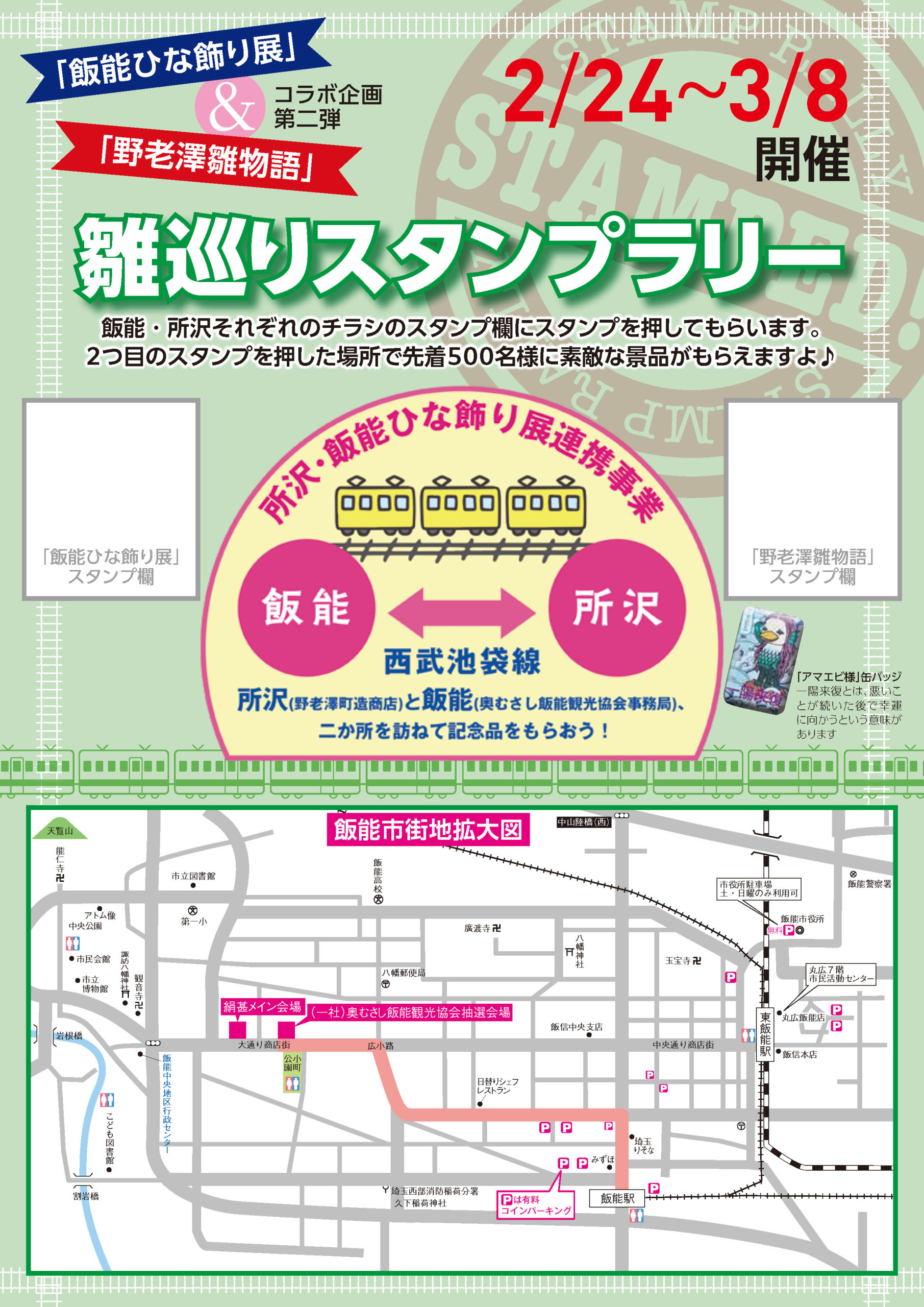 2月24日(火)~3月8日(日) は、飯能の「飯能ひな飾り展」と連携したスタンプラリーも実施されます(景品は先着・なくなり次第終了)。