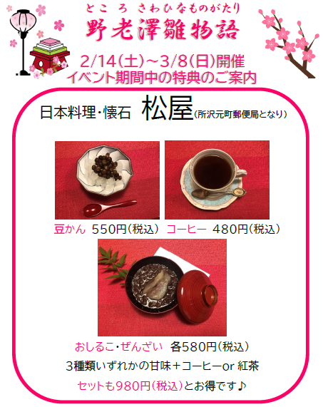 「野老澤雛物語」開催期間(2/14(土)〜3/8(日))中は、商店街の参加店で雛めぐりを楽しめるだけでなく、「松屋」と「ハーヴィーズ」では“ここだけ”の限定特典も用意しています。散策の合間に、ぜひ立ち寄ってみてください。